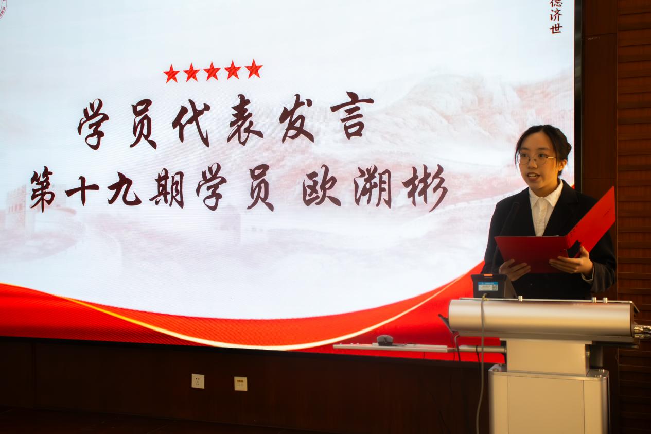 第十九期青马班学员代表欧溯彬发言。她表示,作为青马班的新学员,将深化理论武装,投身服务实践,传承青马精神,争做“又红又专”的新时代金融人才,为强国复兴贡献青春力量。她的发言代表着新学员们对认真学习青马精神的郑重承诺,体现了第十九期青马班学员的精神风貌,彰显了新学员们的学习热情,也展现了新学员们投身强国建设、民族复兴伟业的坚定决心。