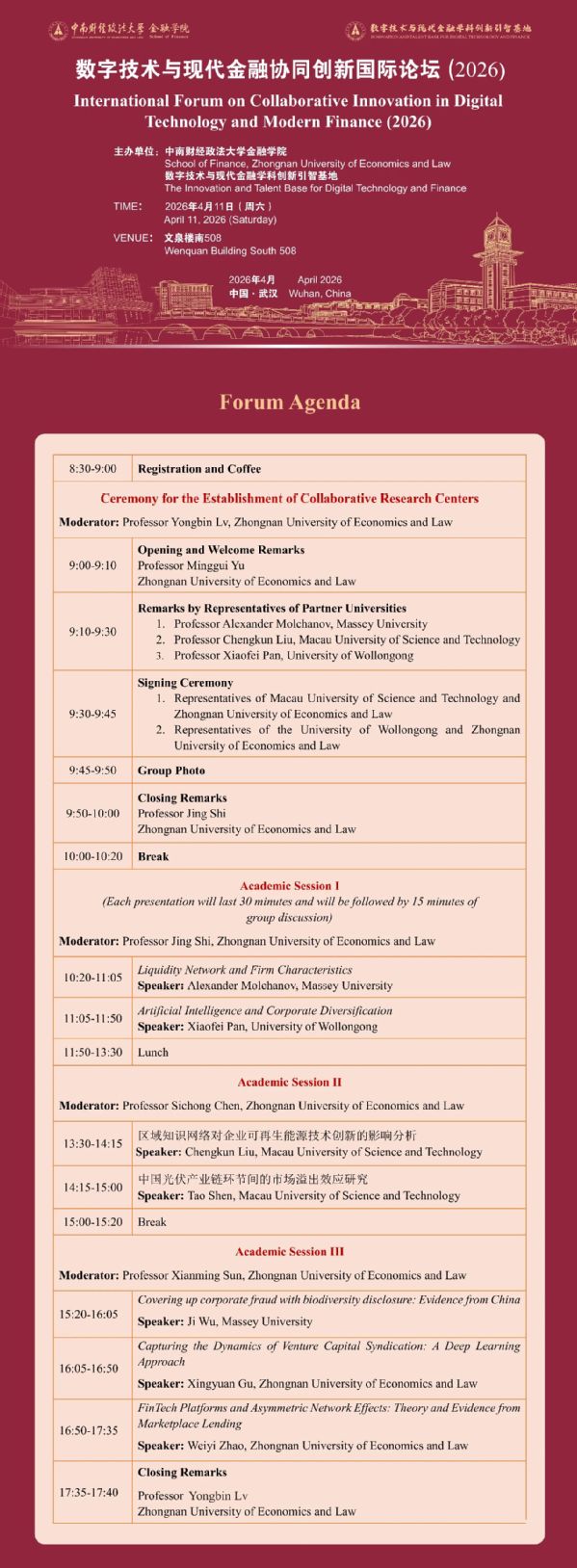 Conference Agenda | International Forum on Collaborative Innovation of Digital Technology and Modern Finance (2026) 2026-04-13 /