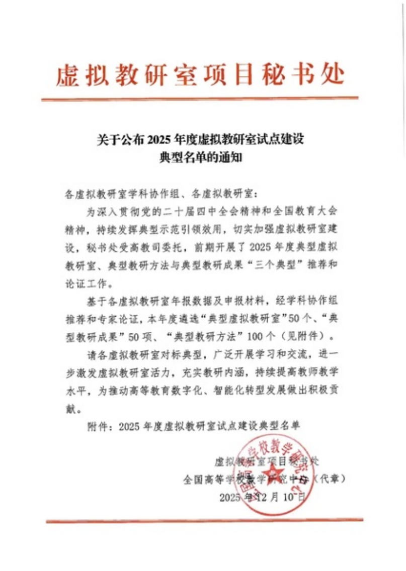 2025年12月10日,虚拟教研室项目秘书处和全国高等学校教学研究中心公布了《2025年度虚拟教研室试点建设典型名单》。我校金融学院牵头的教育部首批虚拟教研室建设试点的银行管理课程虚拟教研室申报的《“银校协同、虚实互促”的产教融合型金融师资培养与教研育人模式》成功入选典型教研方法。这是我校虚拟教研室建设首次获得教育部委托的国家级典型认定,标志着我校在金融学科数字化智能化教研改革领域迈入全国前列。