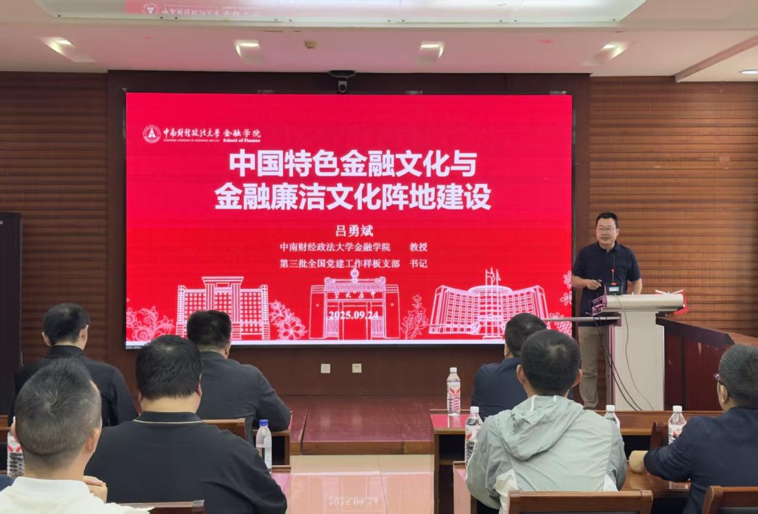 (通讯员 苏婉妹)2025年9月24日下午,中南财经政法大学金融学院与武汉投控集团联合开展的“产业同心·智汇同行”主题系列活动之“同心·践学行”在中南财经政法大学文泉楼南313会议室成功举办。金融学院副院长吕勇斌教授以“中国特色金融文化与金融廉洁文化阵地建设”为题,为到访的武汉投控集团30余名统战系统代表进行专题讲座。