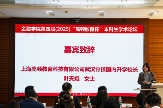 叶天娥女士则以“校企协同育人的初心和成果”为主题,介绍了高顿教育与金融学院在创新型金融人才培养上的共同使命。叶校长表示,校企合作致力于构建大学生集规划、探索、成长于一体的“第三空间”,持续赋能学术生态,本届论坛中的优秀论文聚焦了绿色债券、地方证券债务与企业治理等国家战略议题,展现了金融青年扎根中国实践的探索精神。