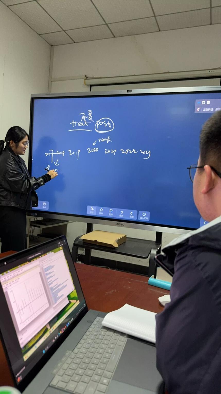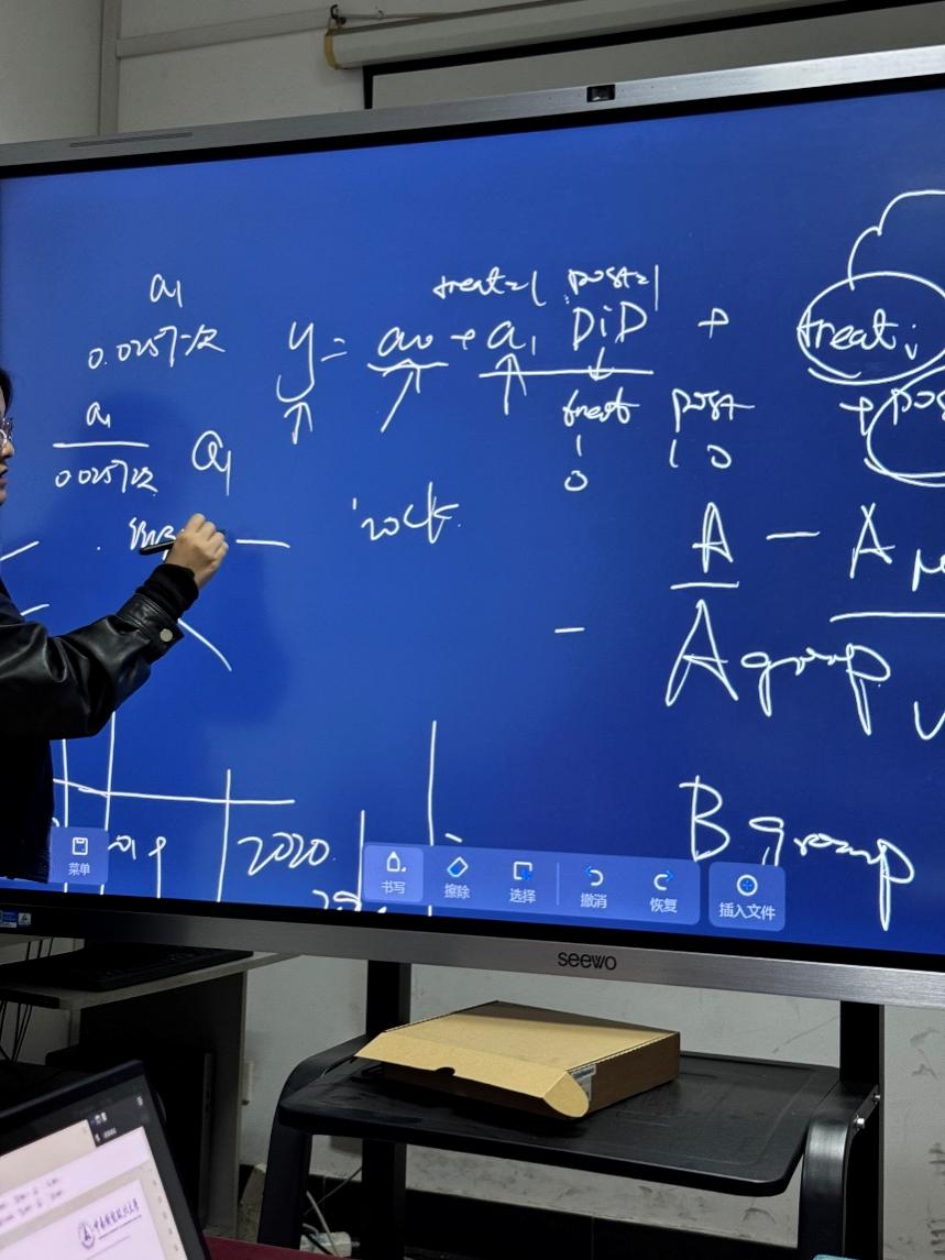 两位同学汇报期间,袁老师进行了随机提问和点评,并就文献中的变量和模型构建、基准回归、事前检验等部分进行了细致讲解。为进一步夯实大家的计量基础,袁老师还围绕双重差分模型展开拓展,从基本逻辑、前提假设到实际操作层层剖析,使同学们对这一重要方法有了更系统的认识。