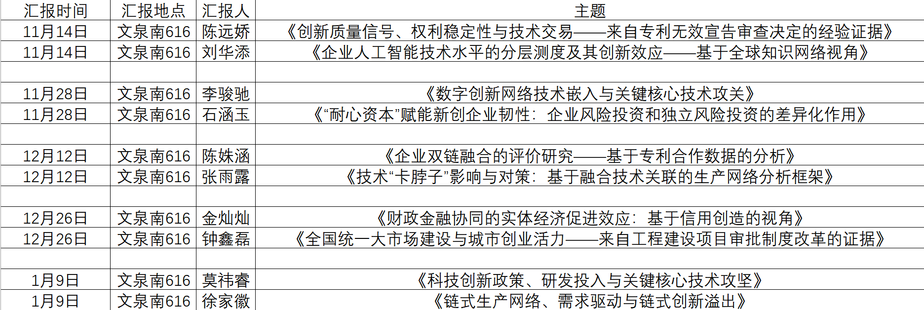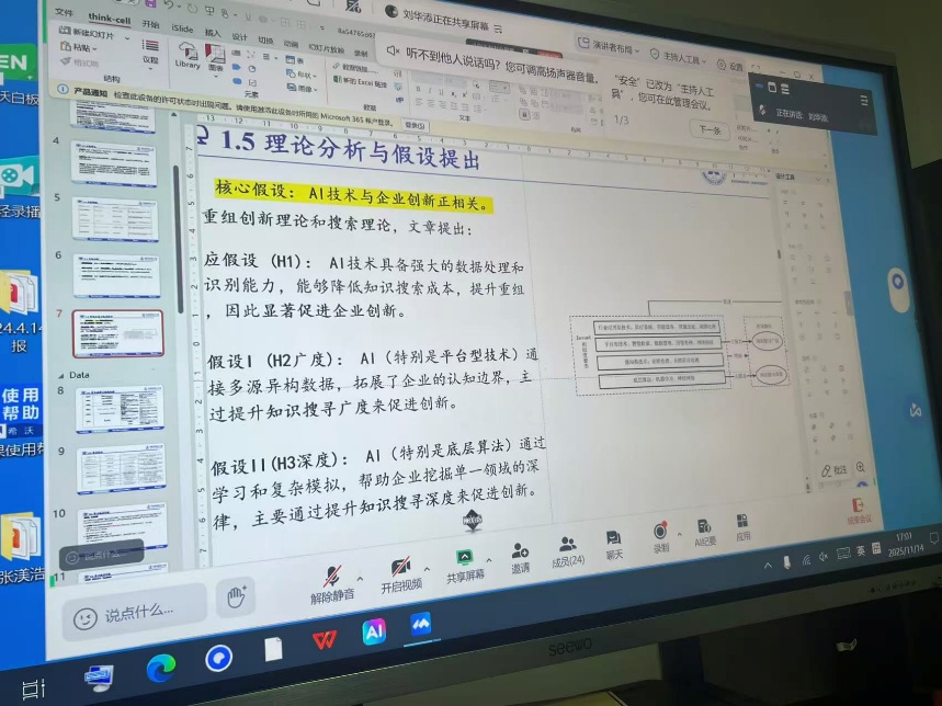 组会上,陈远娇与刘华添两位同学分别就《创新质量信号、权利稳定性与技术交易——来自专利无效宣告审查决定的经验证据》和《企业人工智能技术水平的分层测度及其创新效应——基于全球知识网络视角》两篇前沿文献进行了系统汇报。他们不仅深入阐释了文献的核心概念、研究框架、理论机制与实证分析,还基于原文附件的数据与程序进行了Stata复现,对结果进行了解读。