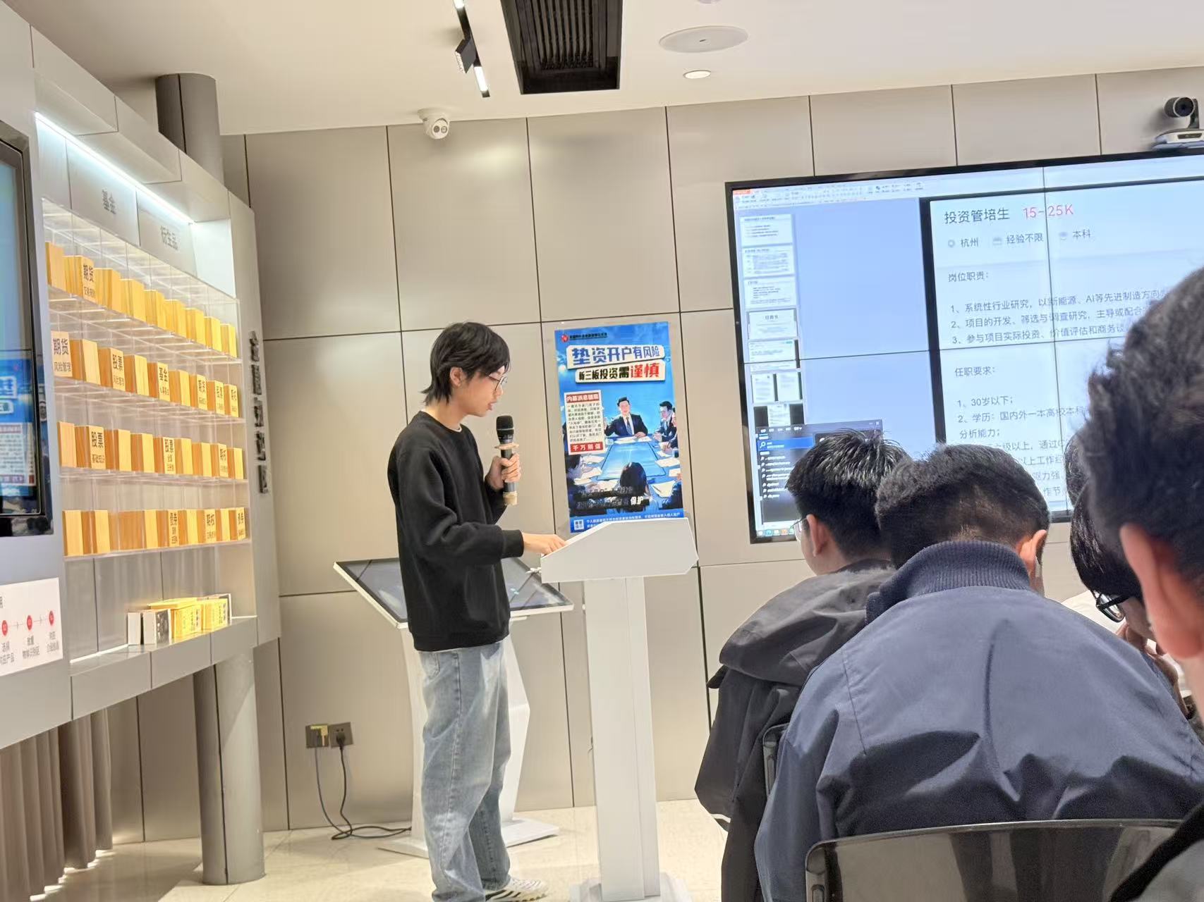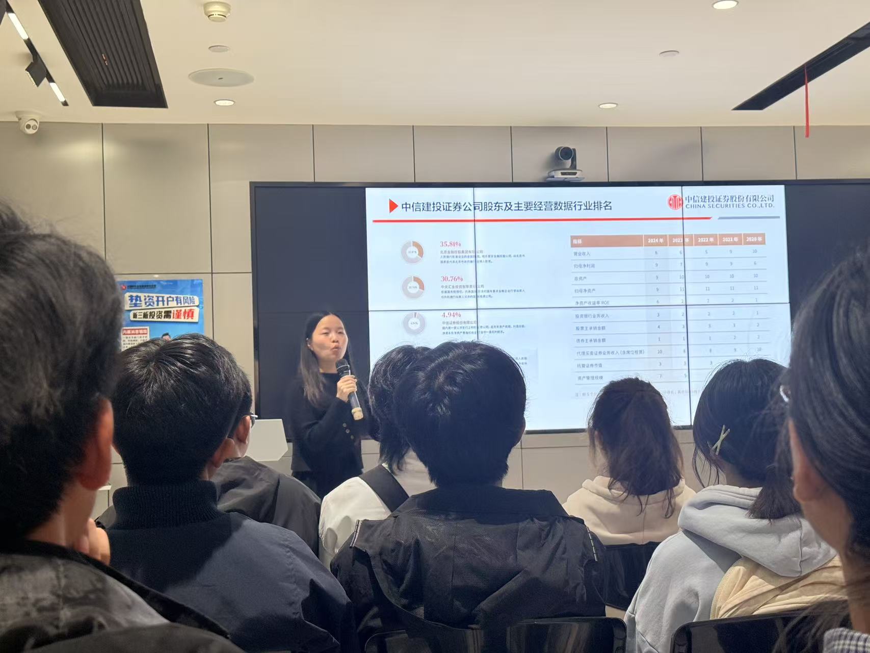 中信建投的负责人对中南财经政法大学师生的到来表示热烈欢迎。教育基地负责人表示,他们始终坚持“宣传证券政策法规,普及证券知识,传导理性投资理念,揭示投资风险,引导依法维权。”的理念。本次参访分成两大板块:第一部分由基地负责人带领大家了解金融行业的发展以及未来前景;第二部分开展相关讲座。