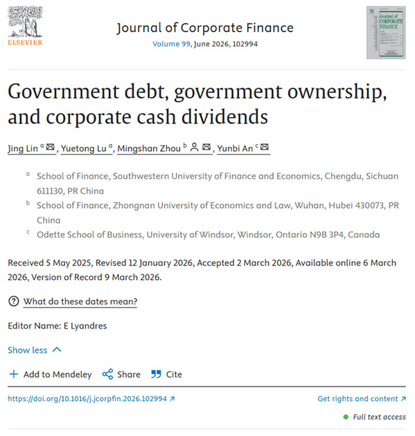 Professor Zhou Mingshan, Vice President of Zhongnan University of Economics and Law and Professor of the School of Finance (corresponding author), has co-authored the paper Government debt, government ownership, and corporate cash dividends, which has been officially published in the Journal of Corporate Finance (JCF), a top journal in the field of corporate finance.This journal is recognized as a Class A journal by Zhongnan University of Economics and Law.