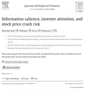 A cooperative paper entitled "Information salience, investor attention, and stock price crash risk", with Chen Zhenshan (first author), a doctoral student from the School of Finance, Zhongnan University of Economics and Law, was published in the Journal of Empirical Finance in February 2026, Volume 85. The journal is an A-class journal recognized by Zhongnan University of Economics and Law.