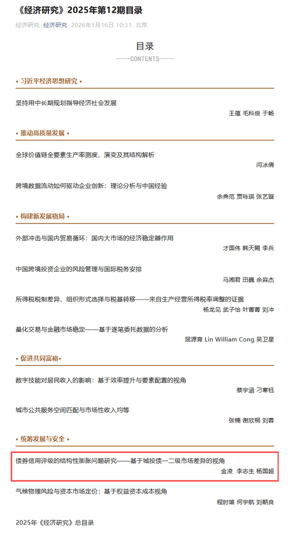 A cooperative paper entitled "Research on the Structural Inflation of Bond Credit Ratings——From the Perspective of the Difference between the Primary and Secondary Markets of Urban Investment Bonds" by Associate Professor Jin Ling (first author) from the School of Finance, Zhongnan University of Economics and Law, Professor Li Zhisheng (corresponding author) from Southwestern University of Finance and Economics, and Professor Yang Guochao from the School of Accounting, Zhongnan University of Economics and Law, was published in the 12th issue of 2025 of Economic Research, which is an A+ class journal recognized by Zhongnan University of Economics and Law.