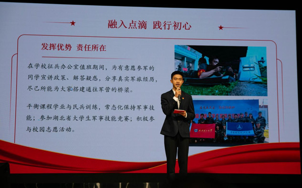 Yuan Zhuohui, recipient of the "Mutual Inspiration in Finance" award, shared how his military service forged his sense of responsibility and honed his professional competence.After returning to campus from military service, he upheld the belief of "retired but not disheartened", practicing his original aspiration and forging ahead through conscription publicity, militia training and leading teams in competitions.